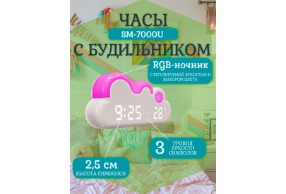 Светодиодный дисплей с высотой символов 1” (2,5 см) Работа от сети и от батареек (AAA*3, в комплект не входят) RGB-ночник с регулируемой яркостью и выбором цвета USB-порт для зарядки мобильных устройств (5 В 1 A) Один режим работы будильника (сигнал) Отложенный сигнал будильника Три уровня яркости символов Формат времени 12/24 часа Индикация температуры Ночной режим Цвет: светло-серый Индикация: белая