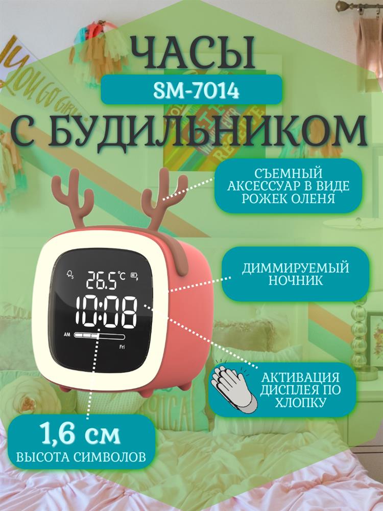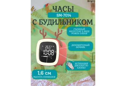 Светодиодный дисплей с высотой символов: 0,6” (1,6 см) Индикация температуры, даты, дня недели, уровня заряда батареи Активация экрана по хлопку Диммируемый ночник Четыре будильника Отложенный сигнал будильника Формат времени 12/24 часа Таймер Встроенный аккумулятор: 1200 мАч Цвет: коралловый Индикация: белая
