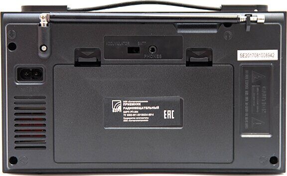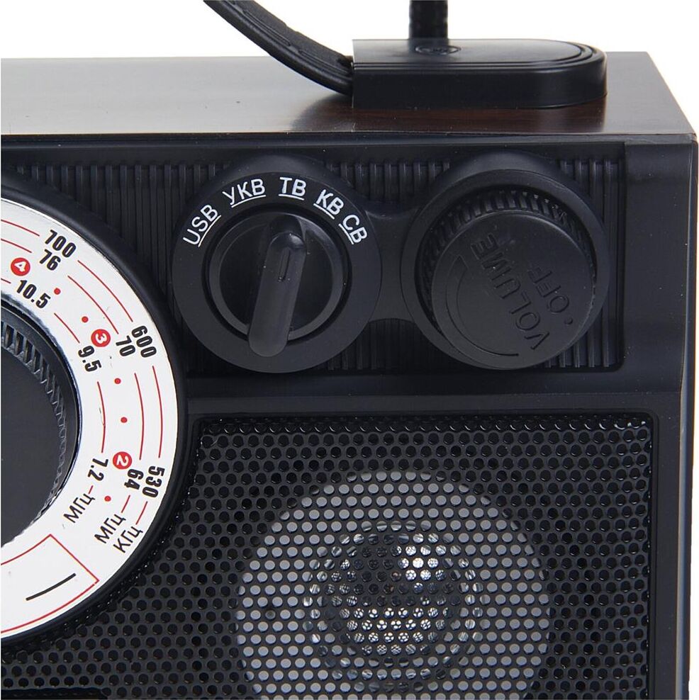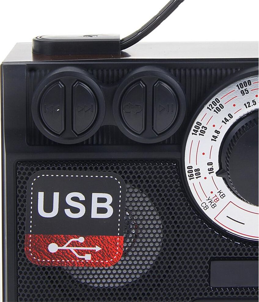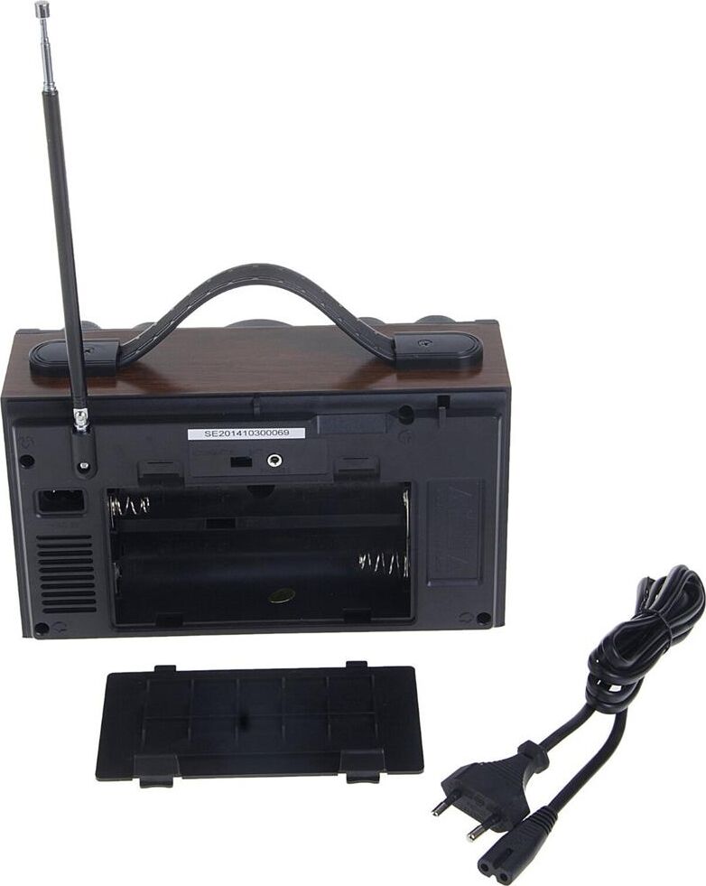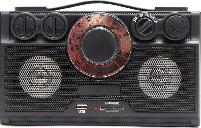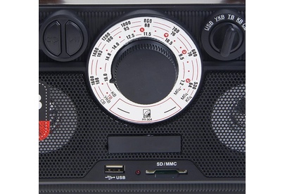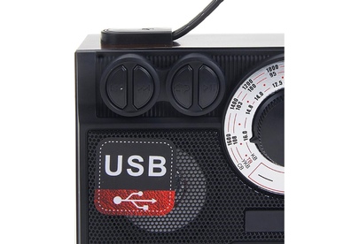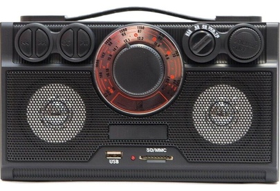 Тюнер аналоговый, УКВ/СВ/КВ диапазоны (УКВ 64-108МГц СВ 530-1600КГц КВ 7,2-16,0Мгц), 2 динамика (монозвук) мощностью Ф64mm/4Ом/3W*2шт, питание 220В, батарейки R20*4шт (не в компл.), размер 215*90*126мм, возможность воспроизведения с USB, SD, телескопическая антенна, разъем под наушники, ручка для переноски.