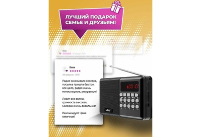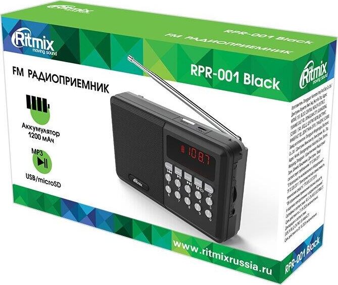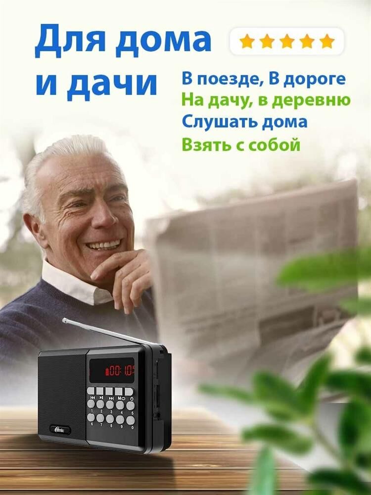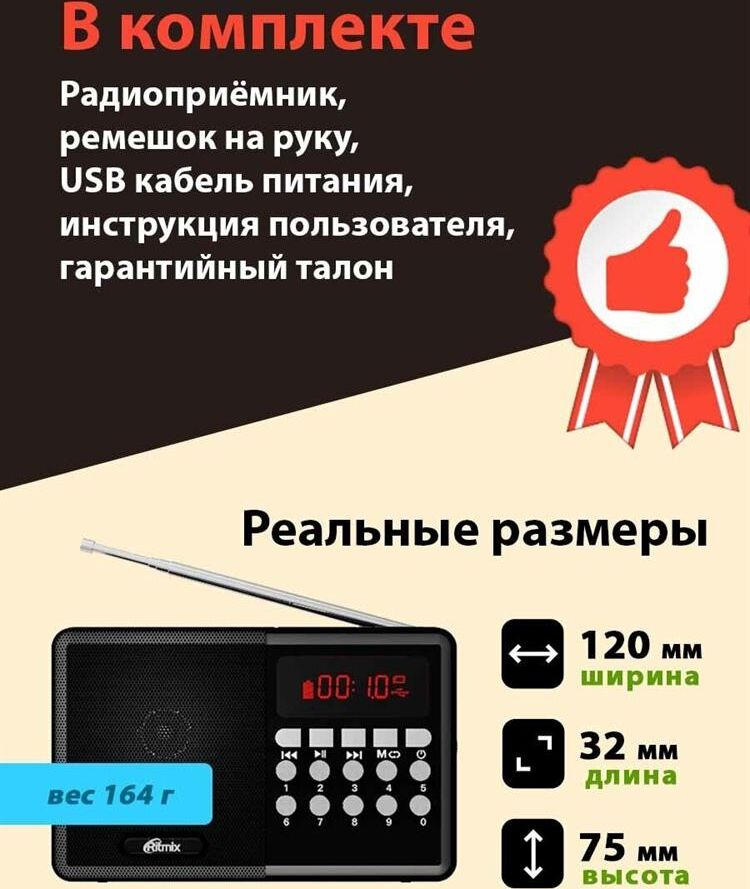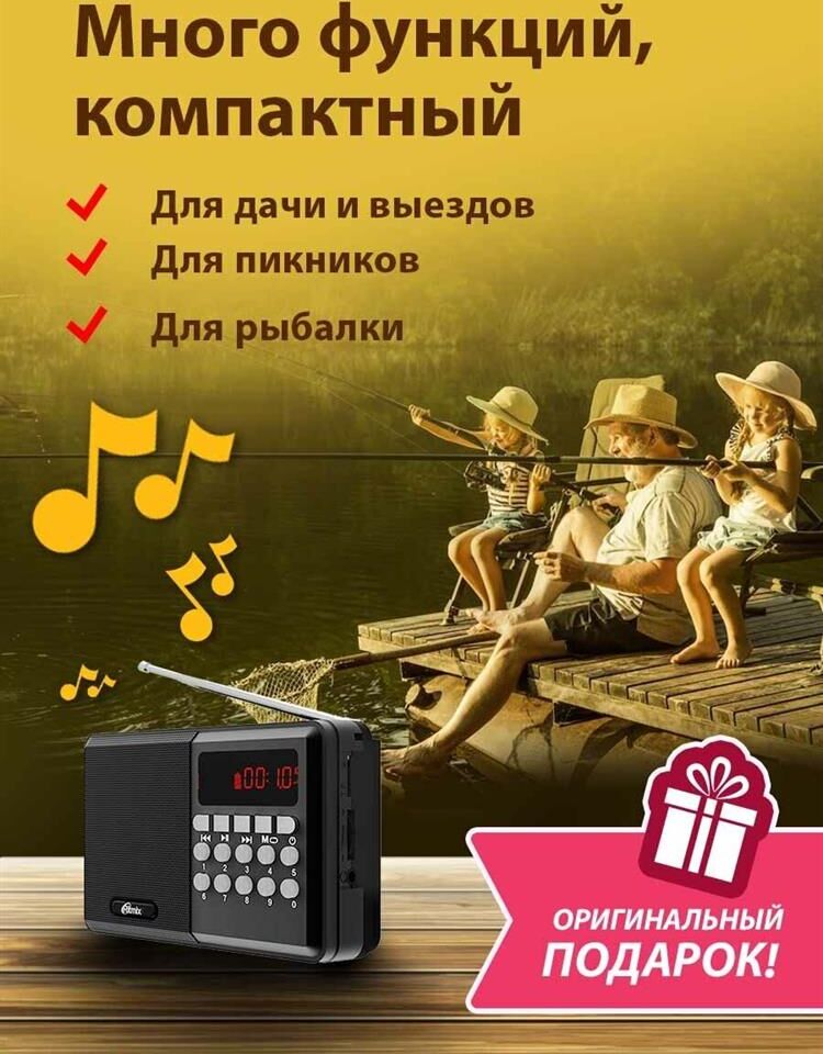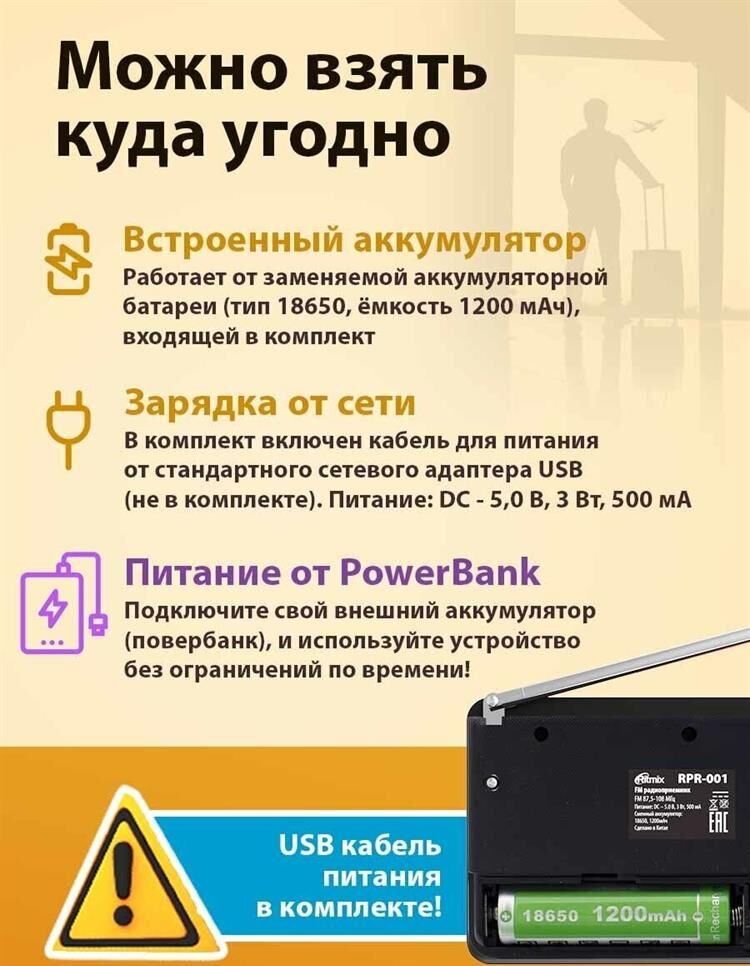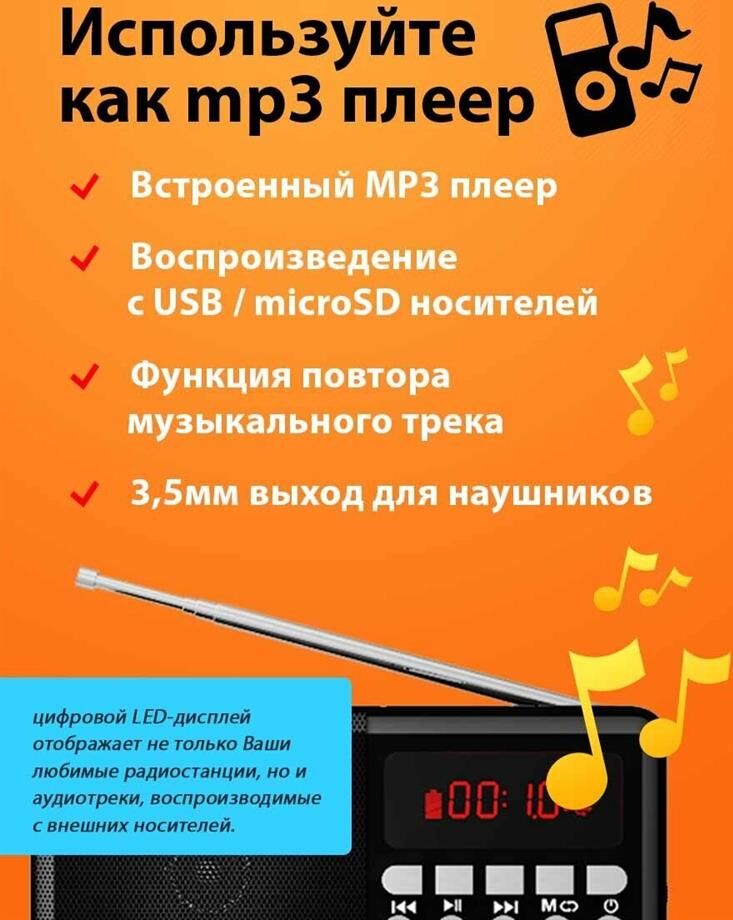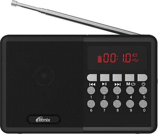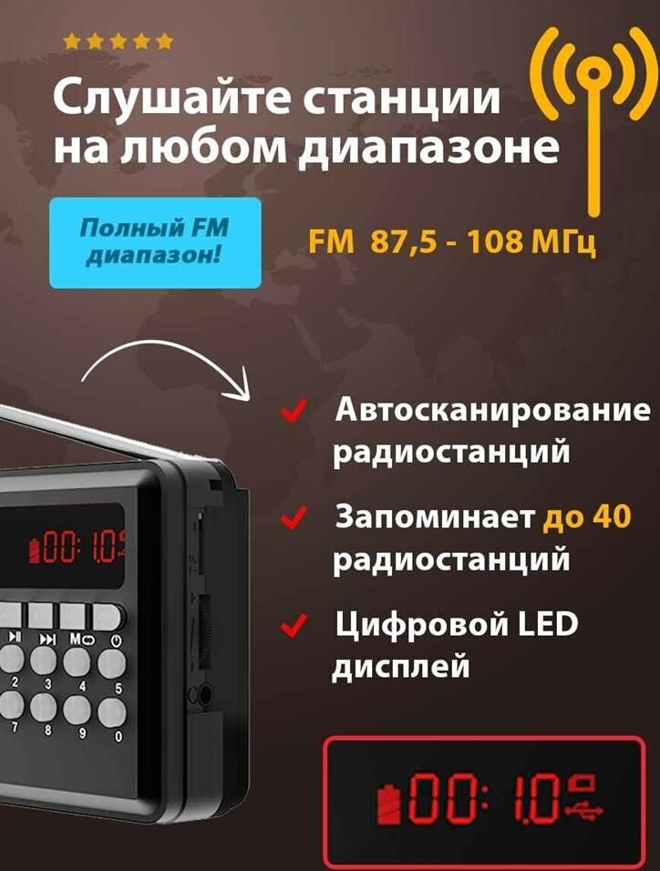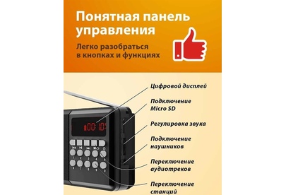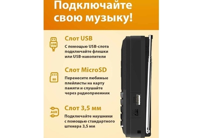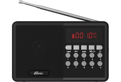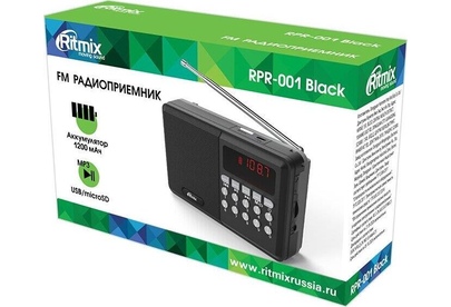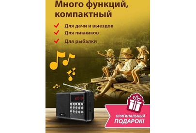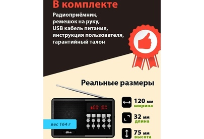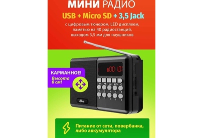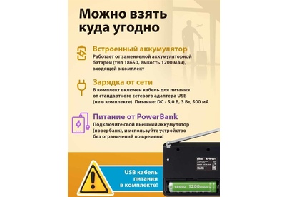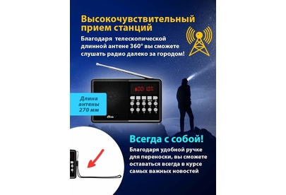 FM-радио, цвет: черный, FM (87,5 - 108 МГц), 1 динамик. Телескопическая антенна, ручка для переноски. Источник питания: AC 220V 50Hz / DC - 5,0 В, батарея Li-ion 18650