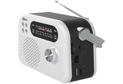 Портативный трёхдиапазонный радиоприёмник с ручкой для переноски. Поддержка Bluetooth v.5.4 и режима MP3, воспроизведение с USB/micro SD карт, питание USB Type-C, сменный аккумулятор на 1200 мАч