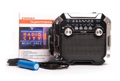 FM/AM/SW диапазон, наличие разъемов USB, microSD, разъем для наушников, функция дискосвета, наличие LED фонарика, батарея тип 18650 1200 мАч, питание 220 в, сетевой шнур в комплекте