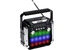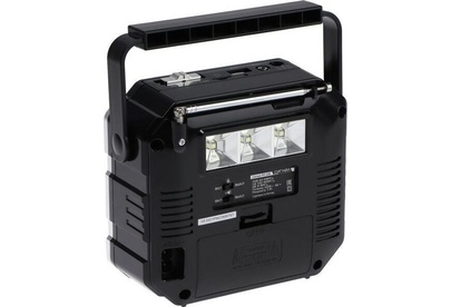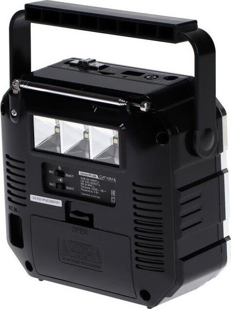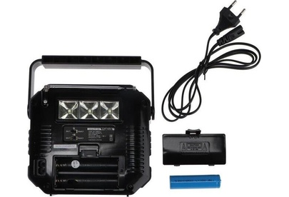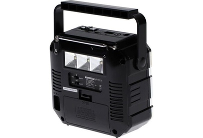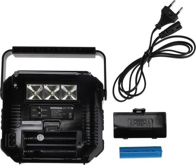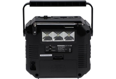FM/AM/SW диапазон, наличие разъемов USB, microSD, разъем для наушников, функция дискосвета, наличие LED фонарика, батарея тип 18650 1200 мАч, питание 220 в, сетевой шнур в комплекте