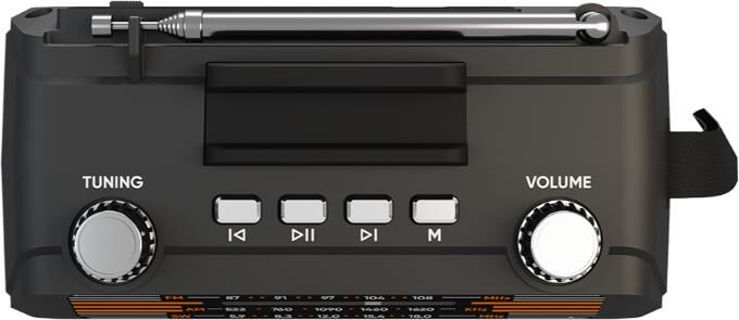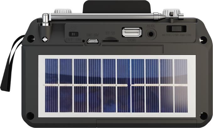 Диапазоны частот: FM/AM/SW Bluetooth 5.3 Поддержка аудионосителей: USB/microSD Аудиовход AUX-in Выходная мощность: 5 Вт Воспроизведение форматов MP3, WAV, WMA, FLAC, APE Батарея: 1200 мАч Солнечная батарея Фонарик Телескопическая поворотная антенна Разъём 5 B для зарядки (microUSB)