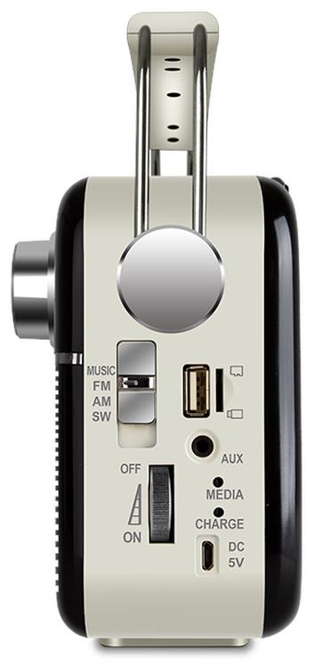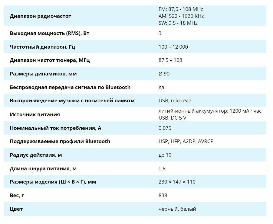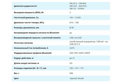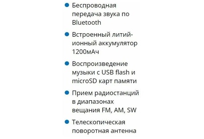 Портативная беспроводная акустическая система , Bluetooth , выходная мощность (RMS) - 4Вт, частотный диапазон, Гц 100 – 12 000, размеры динамиков, мм - O 90, диапазон частот тюнера, МГц - 87.5 – 108, воспроизведение музыки с носителей памяти USB, microSD, источник питания - литий-ионный aккумулятор: 1200 мA · час USB: DC 5 V, размеры изделия (мм) - 230х147х110.