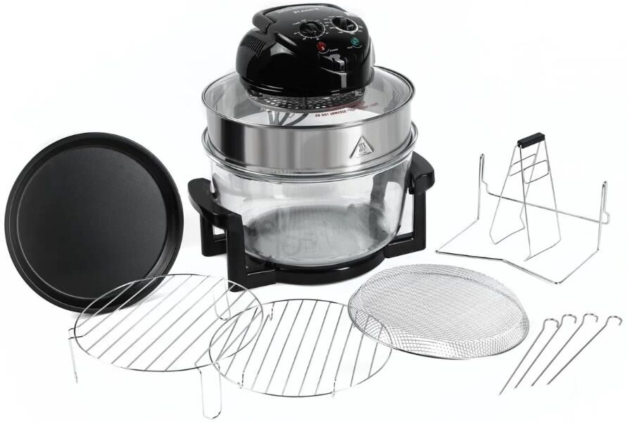 Многофункциональный аэрогриль R201-000 с механическим управлением и галогеновым нагревателем мощностью 1400 Вт станет незаменимым помощником на кухне. Устройство с основным объемом 12 л (расширяемым до 17 л с помощью кольца) из жаропрочного стекла и пластиковой крышкой позволяет готовить при температуре 65-250°С с таймером до 60 минут. 5 автоматических программ и технология циркуляции горячего воздуха обеспечивают идеальные результаты для различных блюд: от выпечки и гриля до приготовления на пару и сушки. Практичные функции включают индикаторы работы и нагрева, регулировку температуры, самоочистку, разморозку (при 100°C для равномерного оттаивания) и съемную крышку. В комплекте: расширительное кольцо, 4 шампура, 2 решетки, противень, фритюрная сетка, щипцы, подставка для крышки, руководство и две коробки (подарочная + транспортировочная). Идеально подходит для здорового приготовления без масла с сохранением сочности продуктов.