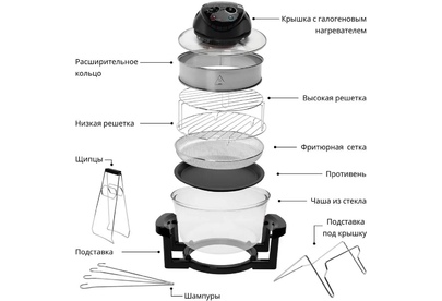 Многофункциональный аэрогриль R201-000 с механическим управлением и галогеновым нагревателем мощностью 1400 Вт станет незаменимым помощником на кухне. Устройство с основным объемом 12 л (расширяемым до 17 л с помощью кольца) из жаропрочного стекла и пластиковой крышкой позволяет готовить при температуре 65-250°С с таймером до 60 минут. 5 автоматических программ и технология циркуляции горячего воздуха обеспечивают идеальные результаты для различных блюд: от выпечки и гриля до приготовления на пару и сушки. Практичные функции включают индикаторы работы и нагрева, регулировку температуры, самоочистку, разморозку (при 100°C для равномерного оттаивания) и съемную крышку. В комплекте: расширительное кольцо, 4 шампура, 2 решетки, противень, фритюрная сетка, щипцы, подставка для крышки, руководство и две коробки (подарочная + транспортировочная). Идеально подходит для здорового приготовления без масла с сохранением сочности продуктов.