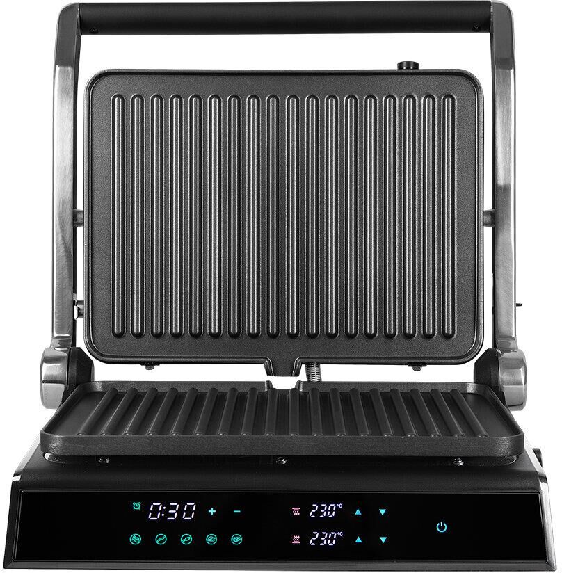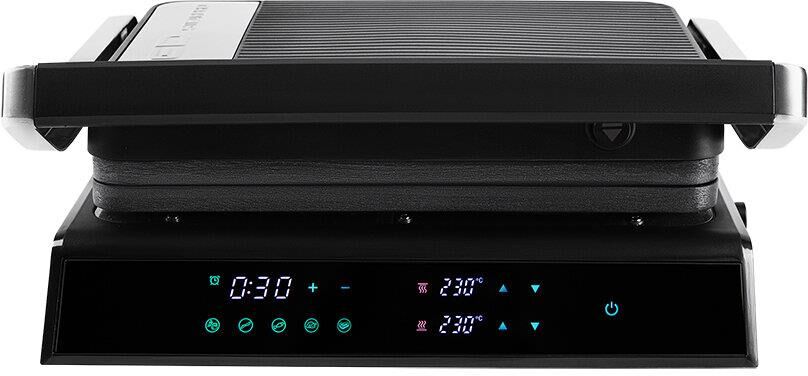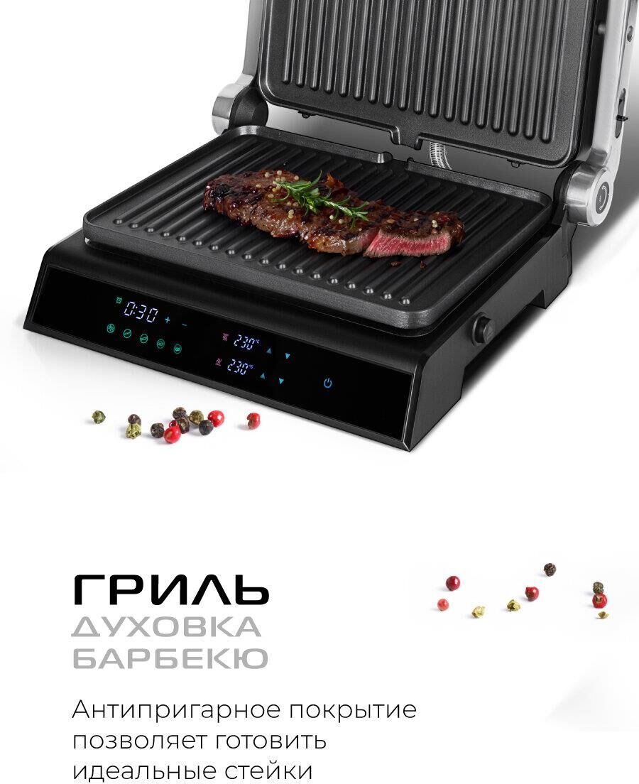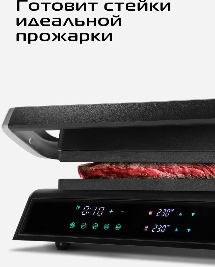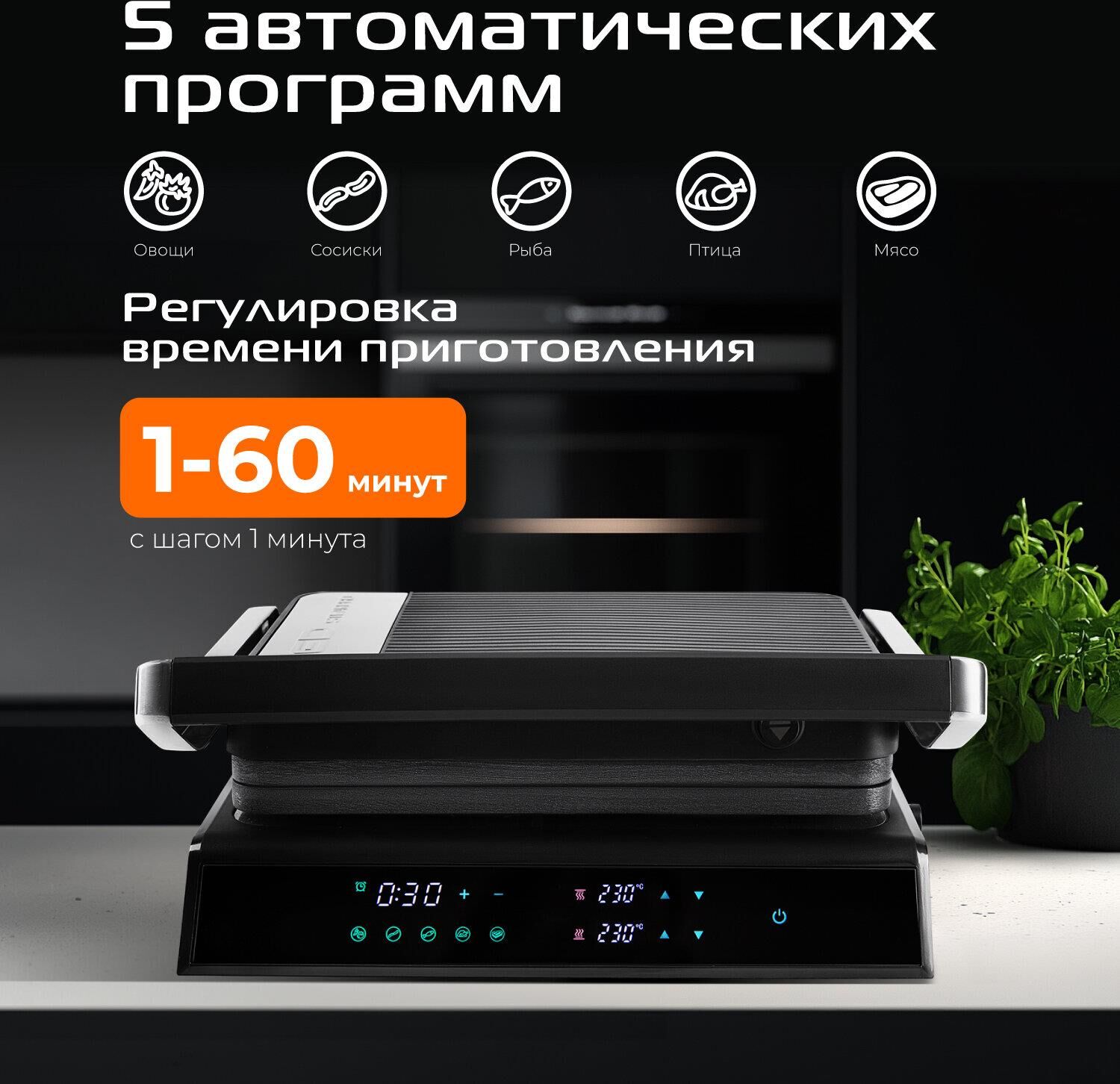 Количество программ/режимов: 5. Тип управления: сенсорное. Тип нагревательного элемента: ТЭН. Установка времени приготовления: есть. Ширина рабочей поверхности: 21.2. Длина рабочей поверхности: 29. Антипригарное покрытие нагревательных частей: есть. Список режимов/программ приготовления: Овощи;Сосиски;Рыба;Птица;Мясо. Установка температуры приготовления: есть. Информационный дисплей: есть. Лоток для сбора жира: есть. Индикатор включения: есть. Индикатор нагрева: есть. Звуковой сигнал: есть. Мойка рабочих поверхностей в посудомоечной машине: да. Вес товара: 4.4. Раздельная регулировка температуры для пластин: есть. Раскрытие на 180 градусов: есть. Длина электрокабеля: 0.8. Габариты упаковки (ед) ДхШхВ: 0.395x0.184x0.365. Вес упаковки (ед): 4.9. Страна производства: Китай. Гарантия: 12 мес.. Цвет: черный. Материал корпуса: пластик/металл. Размеры (ШхВхГ): 36 х 15 х 31.5см. Мощность: 1950 Вт. Температура: 90 - 230 °С. Нагревательный элемент: ТЭН. Мощность: 1950 Вт. Количество программ/режимов: 5. Особенности: ра