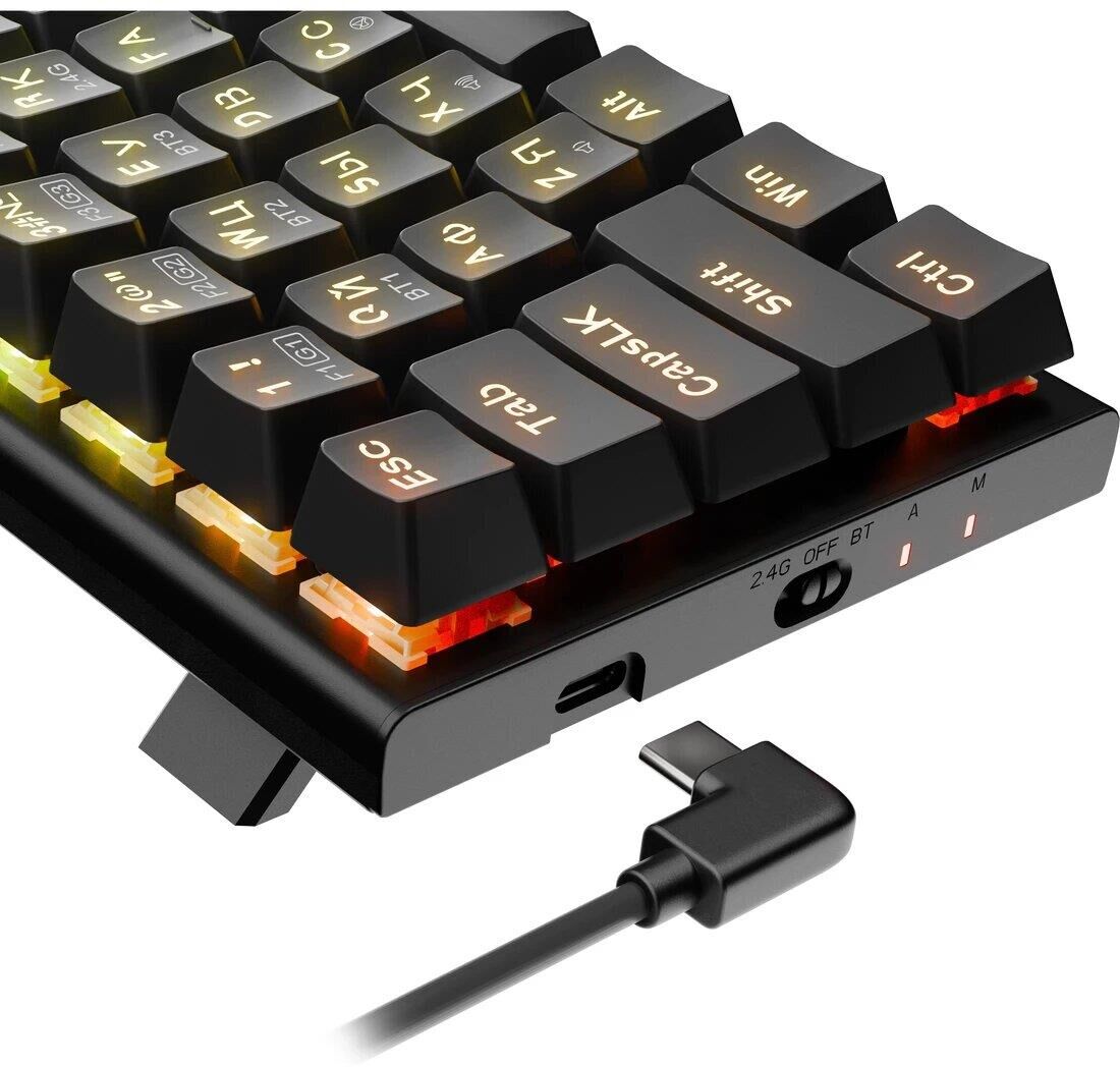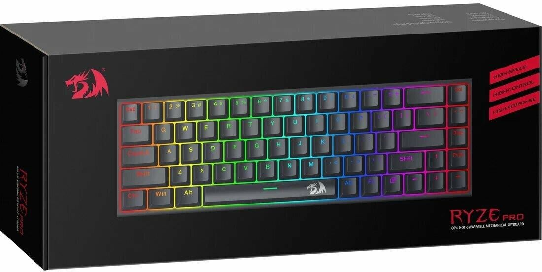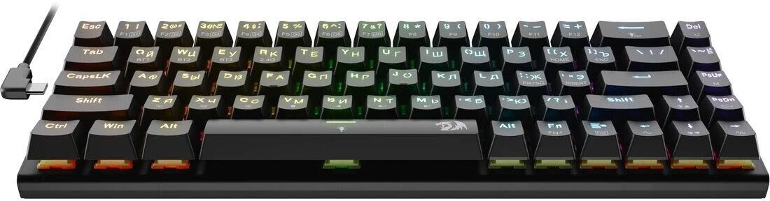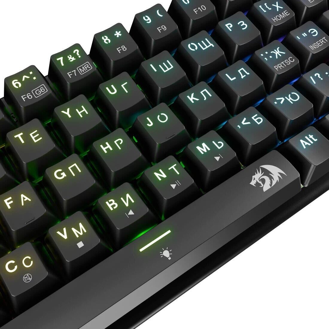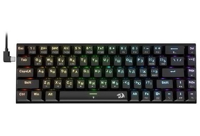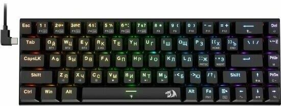 Интерфейс: USB. Тип беспроводного соединения клавиатуры: Bluetooth/Радиоканал. Мультимедийные дополнительные клавиши: есть. Для геймеров: да. Обычная/тонкая: обычная. Подсветка клавиш: есть. Клавиатура с русскими буквами: ДА. Дизайн клавиш: квадратные. Длина кабеля: 1.8. Тип элементов питания: собственный аккумулятор. Максимальное время работы: нет. Цвет английских букв: прозрачный. Цвет русских букв: прозрачный. Вес: 0.65. Механическая: да. Тип соединения: беспроводная. Количество клавиш: 68. Тип подсветки: RGB. Тип механических переключателей: Redragon Maple. Габариты упаковки (ед) ДхШхВ: 0.36x0.155x0.065. Вес упаковки (ед): 0.65. Страна производитель: Китай. Гарантия: 18 мес.. Размеры клавиатуры (ШхВхТ): 310 х 34 х 104 мм. Цвет: и черный. Беспроводной интерфейс: Bluetooth/Радиоканал. Цвет английских букв: прозрачный. Конструктив: механическая. Цвет русских букв: прозрачный. Тип соединения: беспроводная. Особенности: мультимедийная, для геймеров. Встроено: подсветка клавиш. Интерфейс: USB