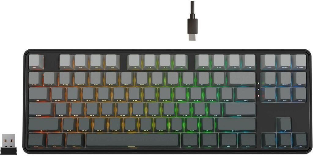 Интерфейс: USB. Тип беспроводного соединения клавиатуры: Bluetooth/Радиоканал. Для геймеров: да. Обычная/тонкая: обычная. Подсветка клавиш: есть. Клавиатура с русскими буквами: ДА. Дизайн клавиш: квадратные. Длина кабеля: 1.5. Радиус действия клавиатуры: 10. Тип элементов питания: собственный Li-ion аккумулятор. Максимальное время работы: 300 часов. Цвет английских букв: прозрачный. Цвет русских букв: прозрачный. Материал корпуса: пластик. Вес: 0.84. Подходит для ТВ: да. Механическая: да. Тип соединения: беспроводная. Количество клавиш: 87. Тип подсветки: RGB. Тип механических переключателей: Redragon Mint Mambo L. Страна производитель: Китай. Время отклика: 10. Гарантия: 12 мес.. Размеры клавиатуры (ШхВхТ): 364 х 37 х 133 мм. Цвет: серый,черный. Конструктив клавиатуры: компактная. Особенности клавиш: клавиша функции (Fn), клавиши управления мультимедиа, управление подсветкой. Конструктивные особенности: разъемы USB, шумоизоляция корпуса. Интерфейс: USB. Цвет русских букв: прозрачный. Особенности: подходит дл