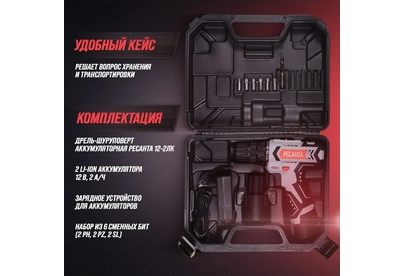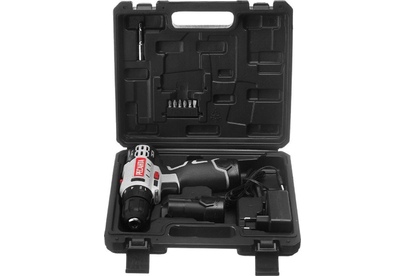 шуруповерт, дополнительный аккумулятор, адаптер питания, бита – 6 шт., удлинитель для бит, инструкция
