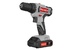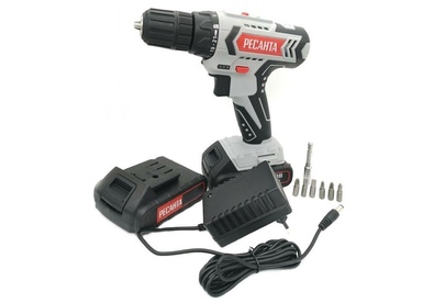 дрель-шуруповерт, два аккумулятора, зарядное устройство, набор бит, удлинитель для бит, кейс, инструкция