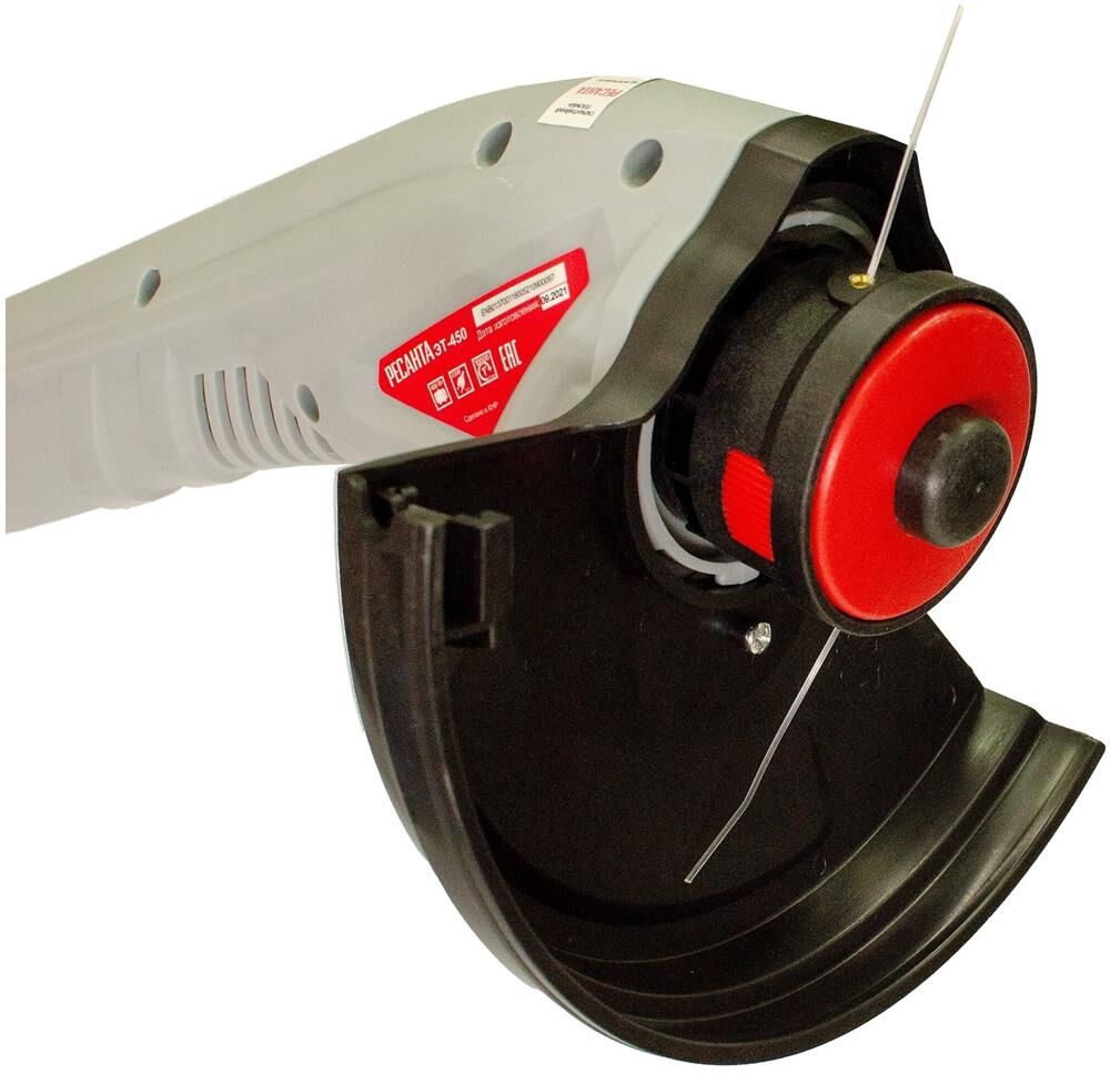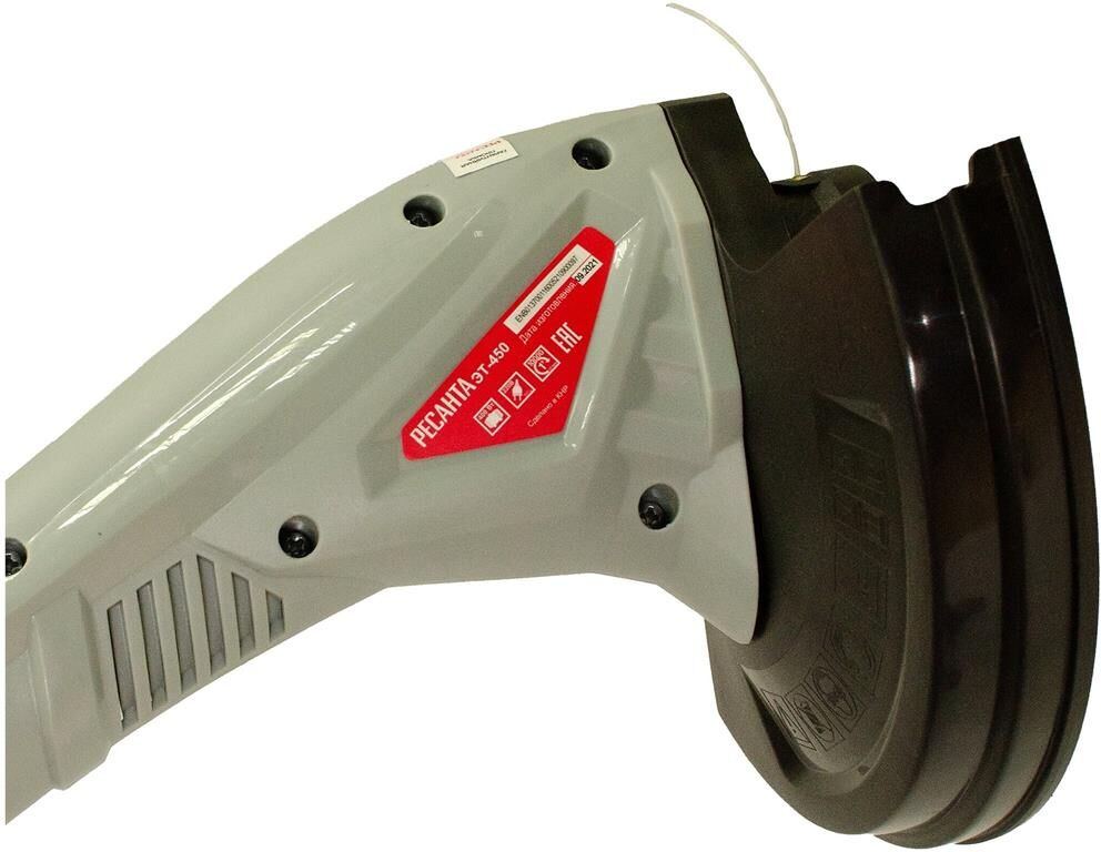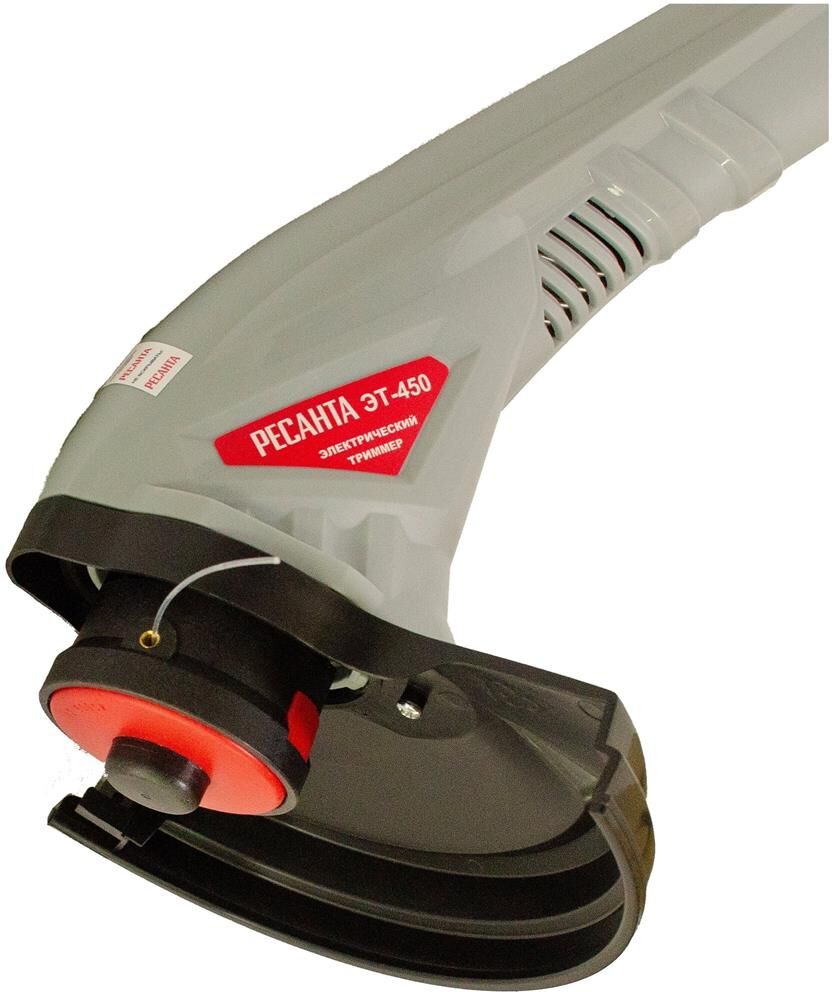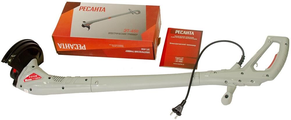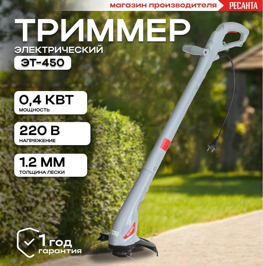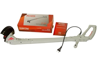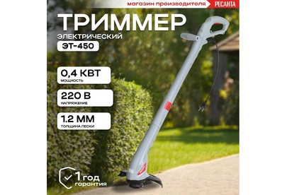 Триммер электрический ЭТ-450 Ресанта - надежный инструмент для кошения мягкой молодой травы на небольшой площади. Подойдёт для работы на приусадебном участке или в саду. Ширина обработки - 22 см. На основной рукоятке предусмотрена мягкая накладка для удобного удержания инструмента. Электрический двигатель расположен внизу. Головка с леской – режущая часть триммера, состоит из пластикового корпуса и заправленной внутрь его лески диаметром 1,2 мм. Длина кабеля 30 см.