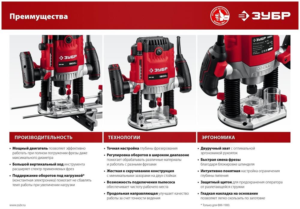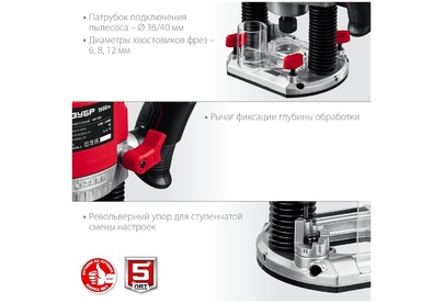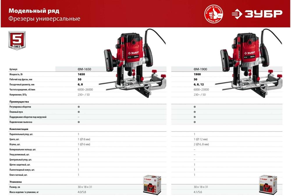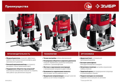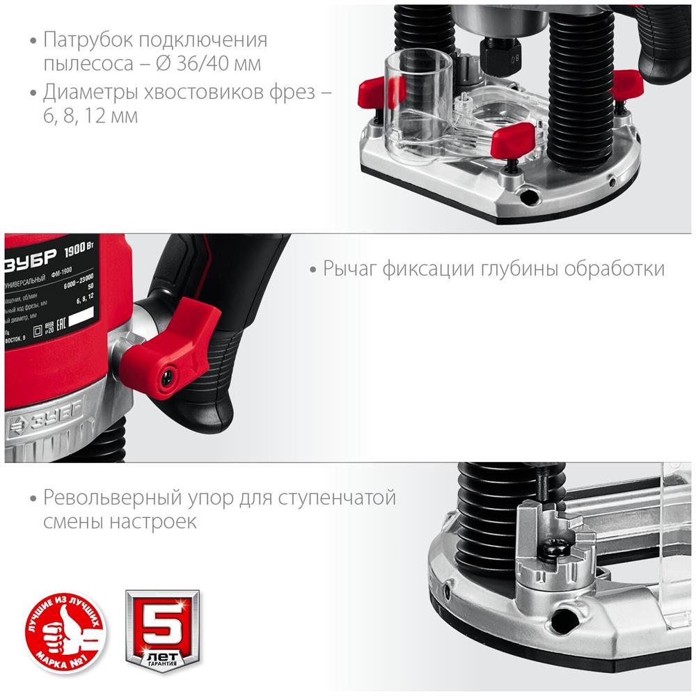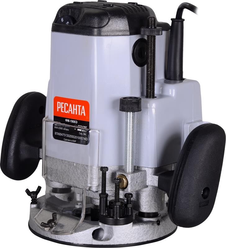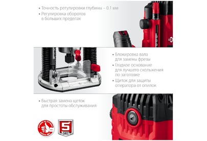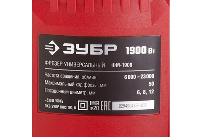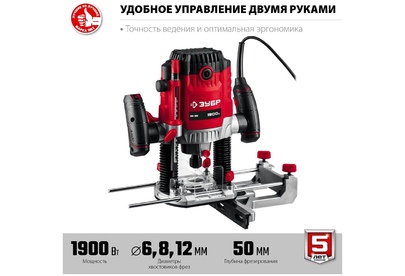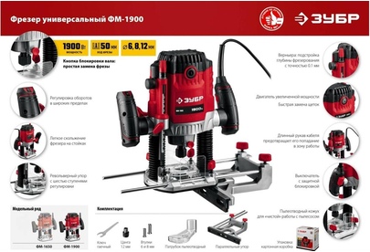 Тип фрезера - универсальный. Мощность - 1900Вт. Макс. обороты - 23000об/мин. Рабочий ход фрезы - 50мм. Цанга - 6/8мм. Возможность подключения к пылесосу, поддержание постоянного количества оборотов, блокировка шпинделя, электронная регалировка числа оборотов, в комплекте идет копировальная втулка.