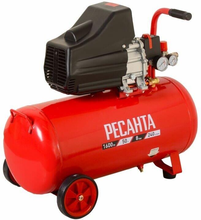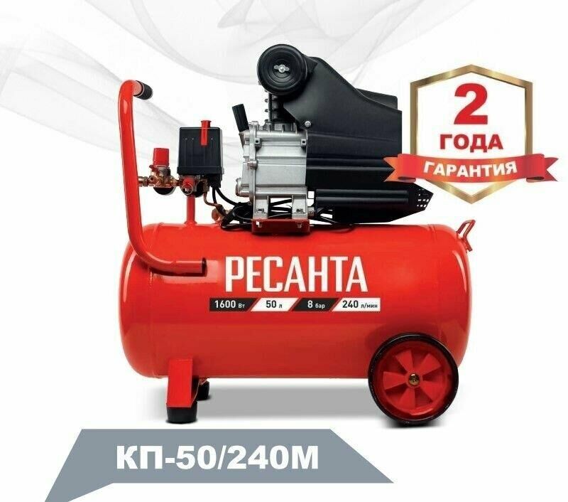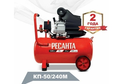 Компрессор КП-50/240М Ресанта - позволяет нагнетать сжатый воздух в пистолеты для накачки шин, краскопульты, пистолеты для продувки и многое другое. КП-50/240М Ресанта используется для выполнения механических работ широкого плана. Компрессор имеет высокую мощность в 1600 Вт, благодаря которой на выходе образуется давление в 8 бар - хороший показатель для современных компрессоров. Производительность модели КП-50/240М Ресанта составляет 240 л/мин, при объеме ресивера 50 л.
