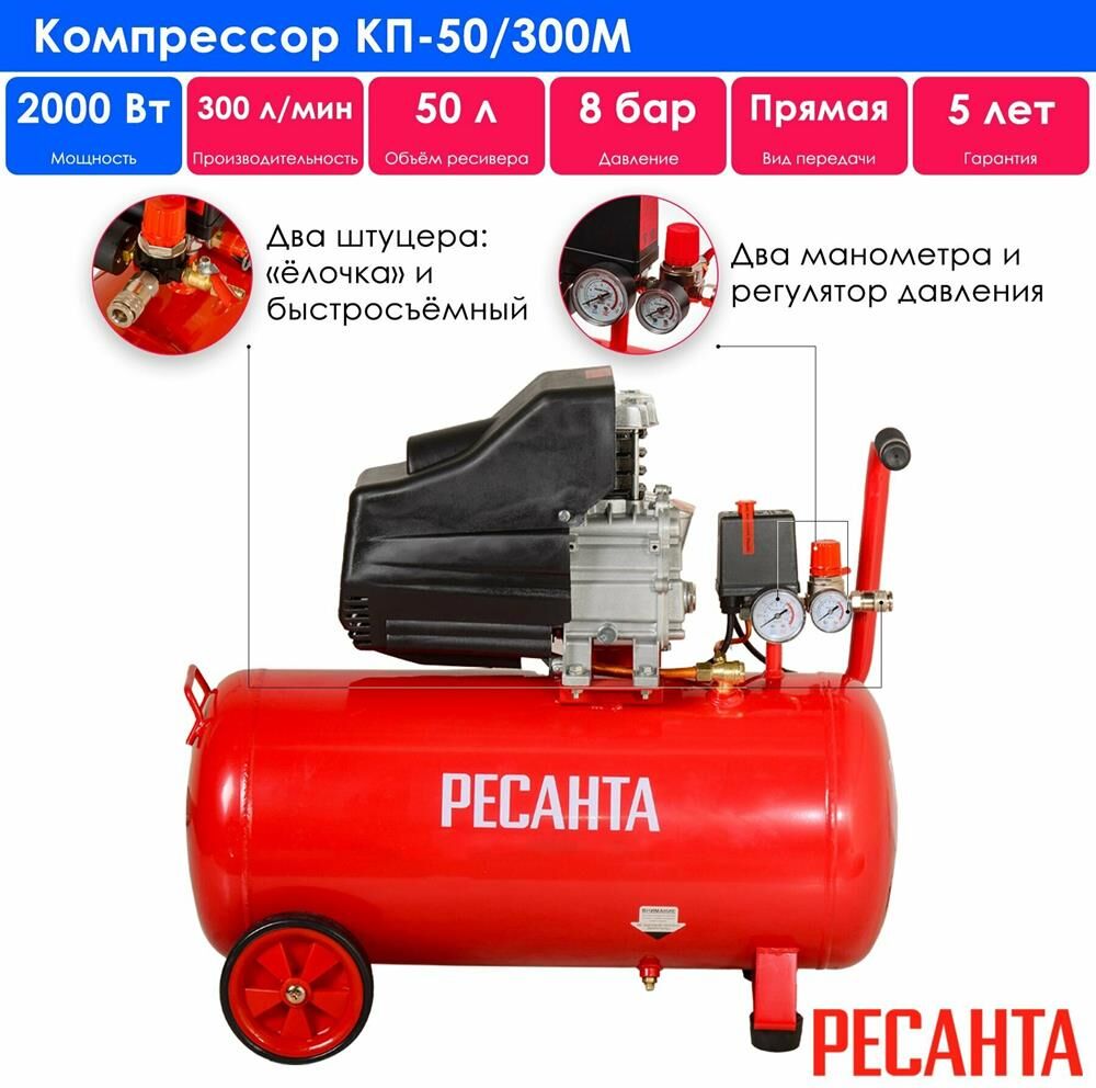 Компрессор КП-50/300М Ресанта. Особенности: Есть транспортировочные колеса и удобная ручка для переноски. Манометр позволяет контролировать давление в ресивере и на выход. Через смотровое окно можно следить за уровнем масла в компрессоре. Электромеханический блок управления давлением в ресивере. Предохранительный механический клапан высокого давления. Дренажный клапан для слива конденсата. Преимущества: Система фильтрации воздуха. Тихая работа. Защита от перегрева. Масло в комплекте.