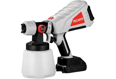 Краскопульт аккумуляторный Ресанта АКП-20Li 75/17/3 - аккумуляторный краскораспылитель Ресанта, предназначенный для нанесения лакокрасочных материалов, грунтовок, морилок, средств защиты древесины и растений, масел, антикоррозионных покрытий, дезинфицирующих средств на основе растворителей и воды и других неэлектропроводных жидкостей определенной вязкости на небольшие по площади поверхности при помощи воздушного распыления.
