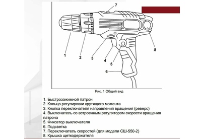 лампа точечной подсветки, блокировка кнопки включения, регулировка частоты вращения