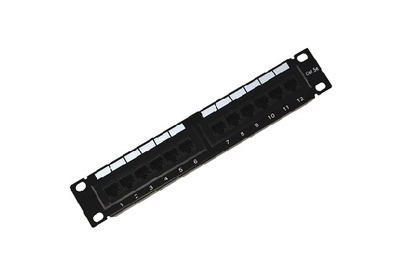 Патч-панель, на лицевой стороне панели - 12 гнезд RJ-45 , на тыльной стороне - контакты, для фиксированного соединения с кабелями, выполнена с однотипными разъемами – неэкранированными RJ-45 разъемами для кабелей категории 5е. Для фиксированного соединен