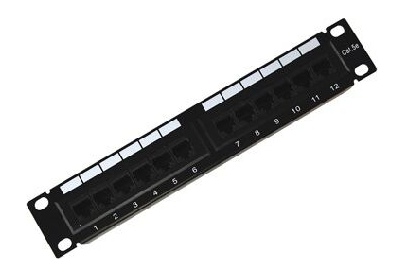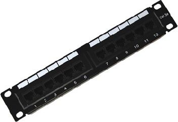 Патч-панель, на лицевой стороне панели - 12 гнезд RJ-45 , на тыльной стороне - контакты, для фиксированного соединения с кабелями, выполнена с однотипными разъемами – неэкранированными RJ-45 разъемами для кабелей категории 5е. Для фиксированного соединен