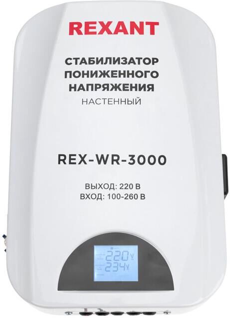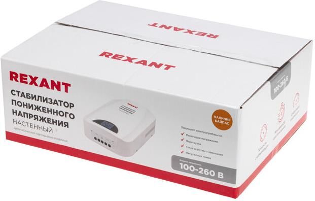 Однофазный портативный стабилизатор переменного напряжения релейного типа марки REXANT предназначен для защиты различных бытовых электроприборов и оргтехники от перепадов напряжения в сети. Он реагирует на некорректную работу сети со значительными перепадами, предотвращает короткое замыкание в диапазоне 140-260 Вольт. Устройство стабилизирует напряжение при отклонении от нормы, благодаря чему исключается внезапная поломка оборудования. Текущие показатели входного/выходного напряжения, а также основные режимы работы стабилизатора отображаются на дисплее. Предусмотрено сглаживание импульсных помех за счет варистора. В случае превышения предельных значений напряжения срабатывает аварийное отключение нагрузки.