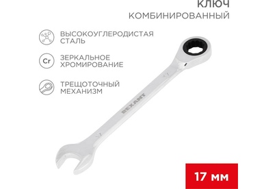 REXANT (12-5812-1) Ключ комбинированный трещоточный 17мм, CrV, зеркальный хром