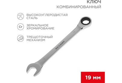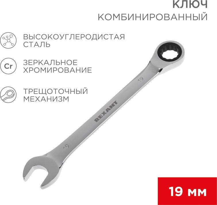 REXANT (12-5813-1) Ключ комбинированный трещоточный 19мм, CrV, зеркальный хром