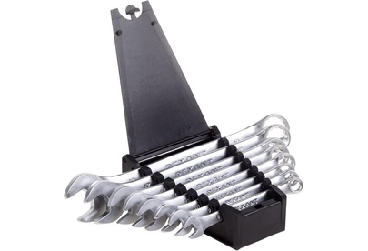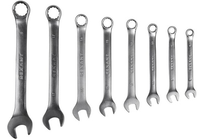 Набор комбинированных гаечных ключей REXANT предназначен для монтажа и демонтажа резьбовых соединений: болтов, гаек, муфт и т. д. Инструменты имеют рожковый профиль с захватом открытого типа с одной стороны и накидной с кольцевым типом с другой. Хромованадиевый сплав, из которого изготовлены ключи, обладает такими свойствами, как прочность, жесткость, устойчивость к износу. Во время прокаливания он менее подвержен деформациям и потере первоначальной формы, чем другие типы инструментальной стали. Хромовое покрытие защищает гаечные ключи от образования ржавчины, продлевает их срок службы. Инструменты просты в обращении и обеспечивают доступ к любому крепежу. Комбинированные ключи применяются в быту, слесарных мастерских и на производстве. Характеристики: Количество ключей в наборе: 8 шт. Размеры: 8, 9, 10, 12, 13, 14, 17, 19 мм Материал: сталь CrV Покрытие: зеркальный хром Количество граней у накидного ключа: 12
