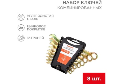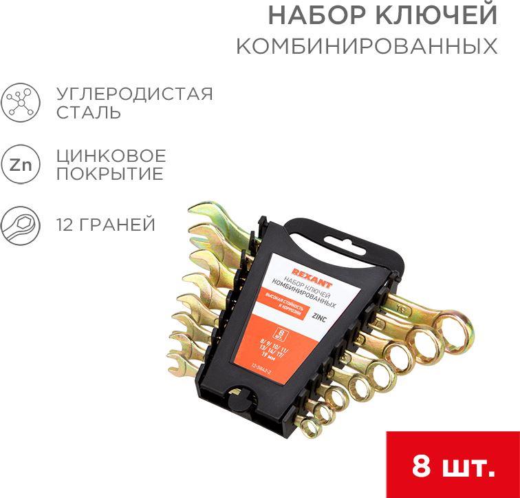 REXANT (12-5842-2) Набор ключей комбинированных (8-11, 13, 14, 17, 19мм), 8 шт, желтый цинк
