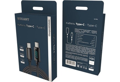 REXANT (18-7074) Type-C ? Type-С, 5A, 100Вт, 1м, в черной нейлоновой оплетке, с LED дисплеем
