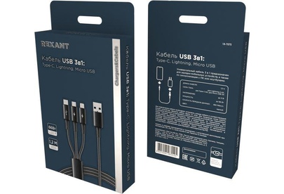 REXANT (18-7075) USB 3в1 Type-С (6A), Lightning (2,4A), micro USB (3A) 1,2м, в черной оплетке