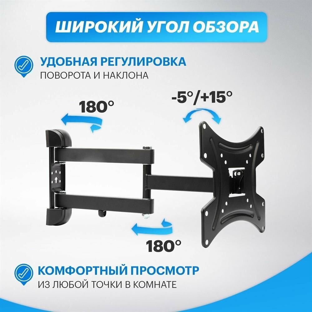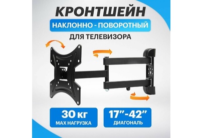 Кронштейн для телевизора. Тип: наклонно-поворотный Назначение: для тел-в Цвет: черный глянец Мин. диагональ: ТВ 17 Макс. диагональ: ТВ 42 Максимальный вес оборудования: 20 кг Угол наклона: -15°/+15° Угол поворота: 180° Установка: настенный Расстояние от стены до ТВ: 87-197 мм Поддержка крепления VESA 75х75 ДА Поддержка крепления VESA 100х100 ДА Поддержка крепления VESA 200х200 ДА