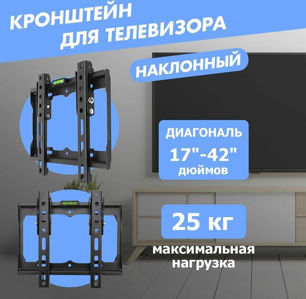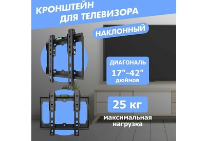 Кронштейн для телевизора. Тип: наклонный Назначение: телевизионный Цвет: черный глянец Мин. диагональ: ТВ 17 Макс. диагональ: ТВ 42 Максимальный вес оборудования: 30 кг Установка: настенный Расстояние от стены до кронштейна: 26 мм Поддержка крепления VESA 75х75: да Поддержка крепления VESA 100х100: да Поддержка крепления VESA 200х100: да Поддержка крепления VESA 200х200: да Угол наклона -0°/+10°