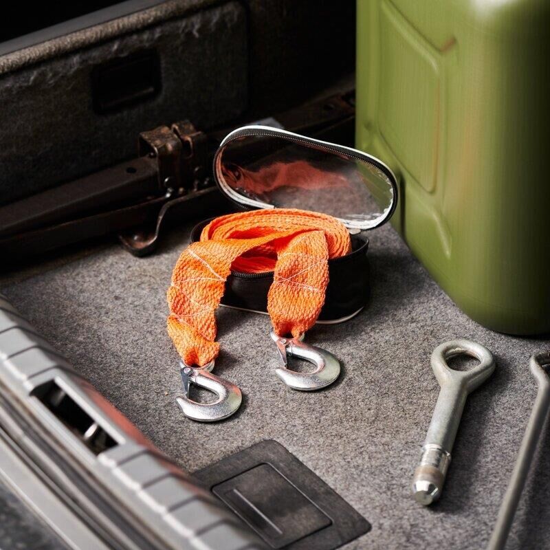 Буксировочный трос предназначен для надежного соединения двух автомобилей с целью безопасной транспортировки или буксировки одного автомобиля с помощью другого. Является незаменимым элементом в случае поломки автомобиля. Трос изготовлен из полипропилена, отличающегося стойкостью к низким температурам и резкому изменению влажности. На концах изделия расположены металлические крюки с пружинным фиксатором. Трос обладает грузоподъемностью до 2,5 тонн и при продолжительной эксплуатации не меняет свои линейные размеры. Длина изделия – 5 м, что обеспечивает достаточное расстояние между автомобилями, позволяет водителям сохранять безопасную дистанцию и маневрировать во время движения. Для удобства хранения и транспортировки трос поставляется в чехле.
