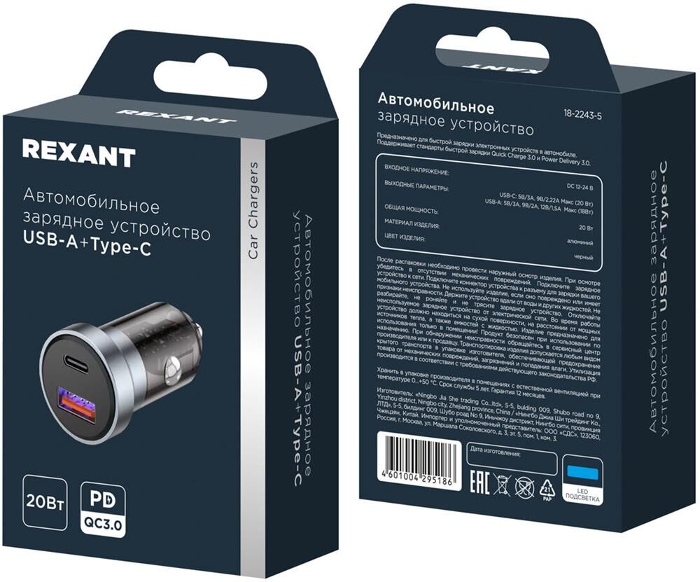 REXANT Автомобильное зарядное устройство c двумя портами (USB-A + USB-C) c LED-подсветкой, 20Вт