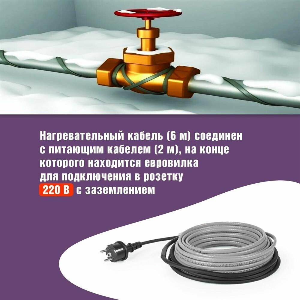 Комплекты саморегулирующегося кабеля MSR-PB REXANT предназначены для защиты от замерзания бытовых трубопроводов, счетчиков воды, вентилей и т. п. Нагревательный кабель соединен с питающим кабелем, на конце которого находится евро-вилка для подключения в розетку с заземлением. Нагревательный кабель является саморегулирующимся и в нормальных условиях его температура не превышает 60 °C. Комплекты подходят для использования как в помещениях, так и на улице. Кабель может быть смонтирован на поверхности как металлической, так и пластиковой трубы, под теплоизоляцией. Кабель может пересекаться сам с собой.