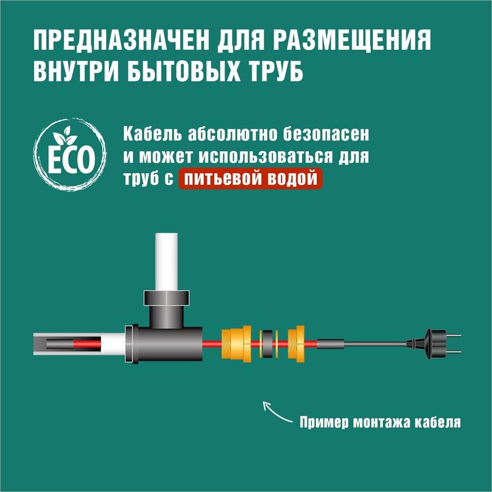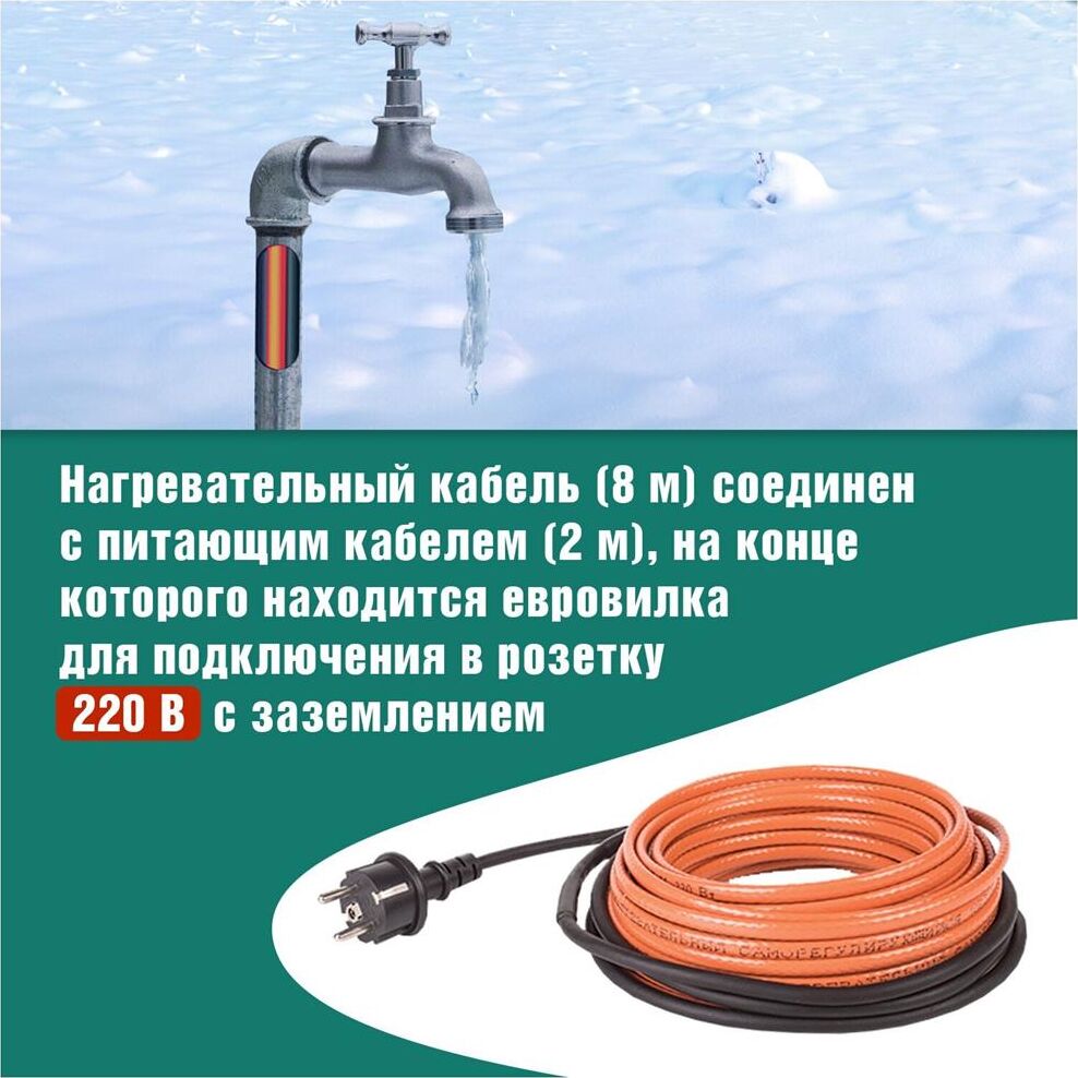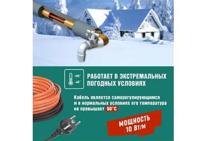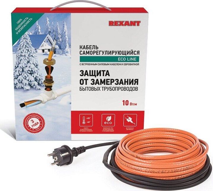 Комплект саморегулирующегося кабеля HTM-CT REXANT предназначен для защиты от замерзания бытовых трубопроводов, счетчиков воды, вентилей и т. п. Нагревательный кабель соединен с питающим кабелем, на конце которого находится евровилка для подключения в розетку с заземлением. Нагревательный кабель является саморегулирующимся и в нормальных условиях его температура не превышает 60 °C. Комплекты подходят для использования как в помещениях, так и на улице. Кабель может быть смонтирован на поверхности как металлической, так и пластиковой трубы, под теплоизоляцией, а также установлен внутрь трубы с водой. Кабель может пересекаться сам с собой.