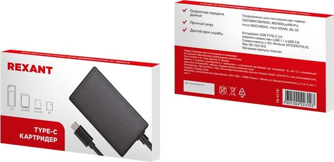 Картридер REXANT Type-C – это современный, легкий и удобный считыватель карт памяти типов DXC, SDHC, SD, ммC, MS, MSDuo, MS Pro, microSDXC, ISDHC, microMS, M2 XD CF.