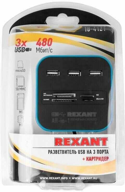 USB разветвитель (хаб) торговой марки REXANT предназначен для подключения нескольких устройств USB одновременно, таких как: компьютерные мыши, клавиатуры и мультимедийные джойстики, модемы и роутеры, внешние жёсткие диски и накопители, фотоаппараты и камеры, смартфоны и планшетные ПК, и даже принтеры. Кроме того в данной модели имеются порты для подключения карт памяти SD/microSD/MS/M2. Т.е. данная модель имеет возможность подключения к себе всех существующих разновидностей карт памяти. Увеличение количества USB портов и портов для карт памяти на вашем компьютере не только снижает их износ, но и облегчает процесс использования. Данный прибор очень компактен и идеально подойдет как владельцам портативных компьютеров, ноутбуков, так и пользователям стационарных компьютеров. USB Хаб REXANT не требует внешнего питания и обеспечивает отличную скорость передачи данных. Благодаря компактному размеру и весу его легко можно носить с собой. Интерфейс: USB2.0, совместим с USB1.1 и USB3.0 Скорость передачи данных: до 4