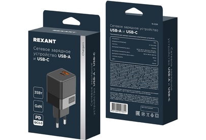 Сетевое зарядное устройство REXANT обладает выходной мощностью 35 Вт и поддерживает стандарты Power Delivery 3.0 и Quick Charge 3.0, что способствует быстрой зарядке различных электронных устройств. Адаптер отличается повышенной безопасностью в эксплуатации, так как защищен от короткого замыкания, повышенного тока, напряжения и перегрева. Модель оснащена разъемами USB-A и USB-C. При изготовлении адаптера используется технология Gan, благодаря чему изделие не сильно нагревается, потребляет меньше энергии и заряжает быстрее, чем обычные зарядные устройства. Продукт представлен в прочном и термостойком корпусе, имеет компактные размеры.
