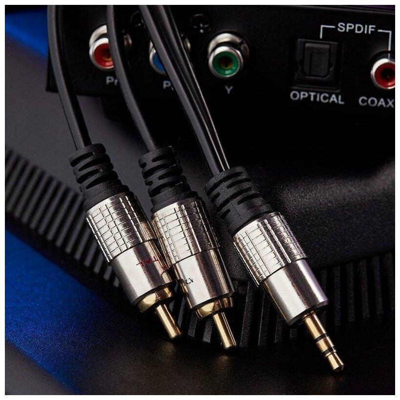 Шнур 3.5 Stereo Plug - 2 RCA Plug 3 м (GOLD) металл REXANT предназначен для передачи аналогового аудиосигнала и широко применяется для видео- и аудиосистем. С одной стороны шнура располагается штекер разъема 3.5 Stereo, а с другой — 2 штекера разъема RCA (традиционный стандарт для аналоговой видео- и аудиотехники). Шнур используется для совместной эксплуатации домашней и й аудиоаппаратуры (микрофоны, электронные музыкальные инструменты, плееры, усилители звука, тв, видеоприставки, мобильные телефоны и т. д.), имеющей разъемы такого типа. С его помощью можно разнести двухканальный звук (стерео) на две точки воспроизведения. Разъемы выполнены из металла, а RCA разъемы из металла зажимные, что обеспечит надежность соединения. Контакты штекеров покрыты слоем золота, нанесенного по технологии вакуумного напыления для улучшения качества передачи сигнала. 3 метра.