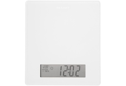Весы кухонные электронные. Платформа из закаленного стекла с сенсорными кнопками управления. Большой LCD дисплей 141?41 мм. Функции: часы/таймер/температура и влажность окружающей среды. Точность измерения 1 грамм, максимальный груз 5 кг. Питание от 4 батареек тип AAA.