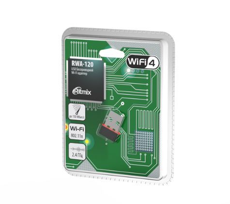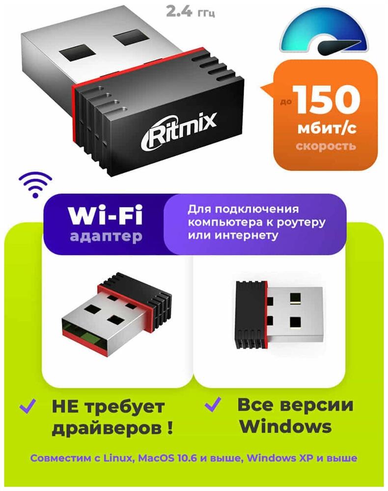 Миниатюрный USB адаптер для ПК или ноутбука позволит подключить его к сети WiFi на частоте 2.4ГГц и создать высокоскоростное подключение до 150Мбит/с. Поддерживаются все версии Windows, не требуется установка драйверов.