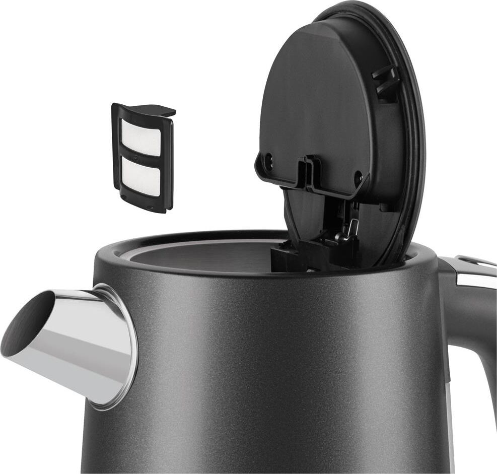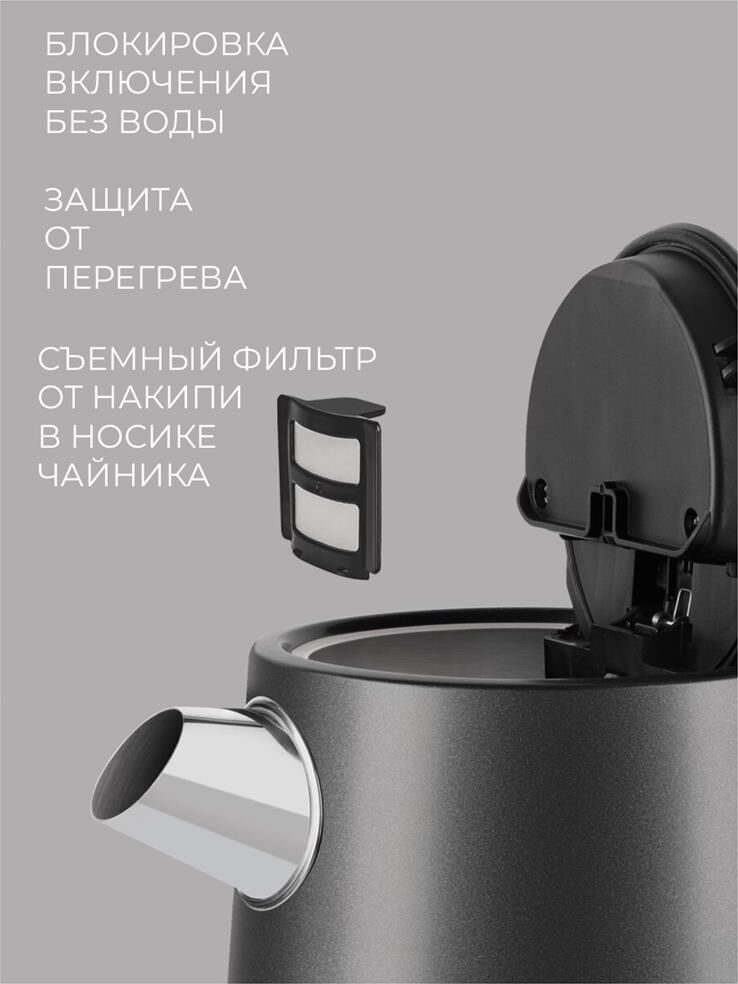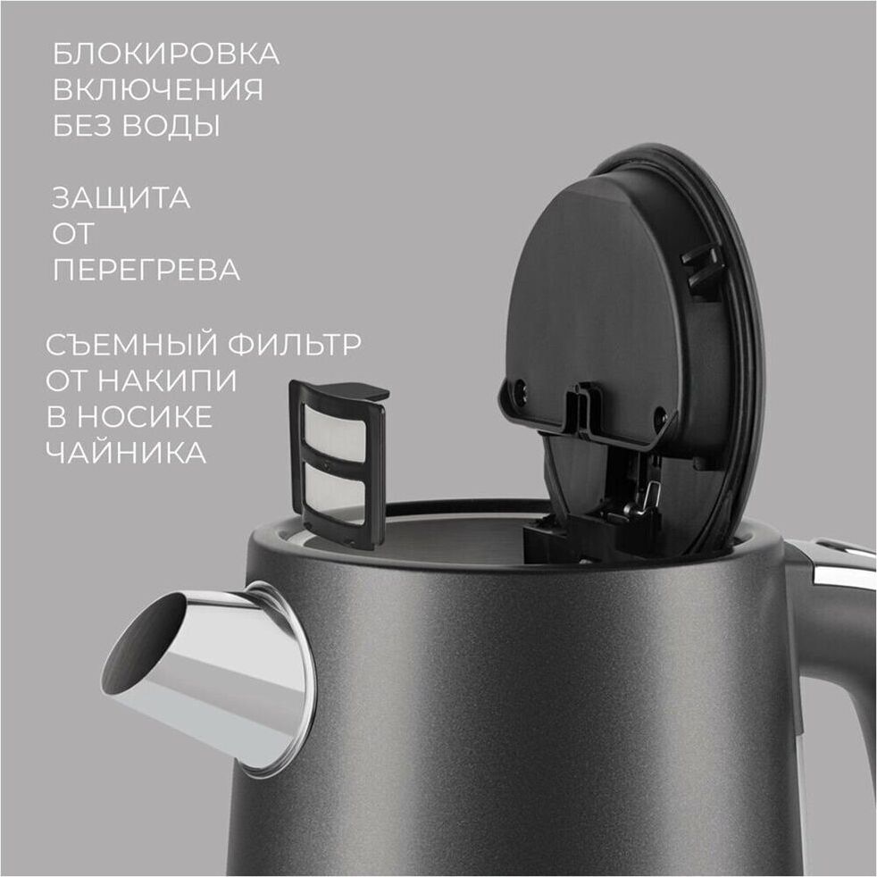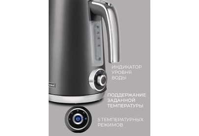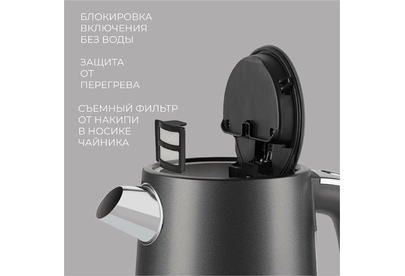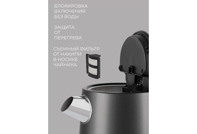 Мощность: 2200. Максимальный объем: 1.7. Нагревательный элемент: скрытый. Цвет: черный. Температурные режимы: 5. Габариты упаковки (ед) ДхШхВ: 0.23x0.21x0.26. Вес упаковки (ед): 1.85. Гарантия: 12 мес.. Материал корпуса: металл. Безопасность: автоотключение, защита от включения без воды. Дополнительные функции: регулировка температуры нагрева. Конструктивные особенности: кнопка открытия крышки, подставка 360, фильтр от накипи. Индикация: включения, уровня воды. Нагревательный элемент: скрытый. Материал корпуса: металл. Мощность: 2200 Вт. Объем: 1.7 л