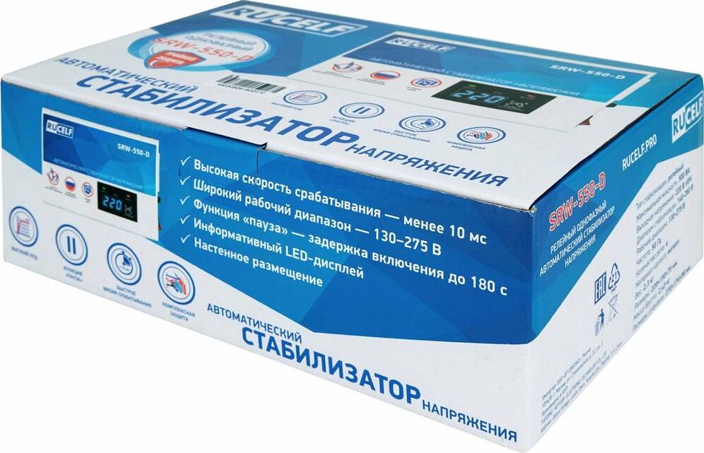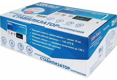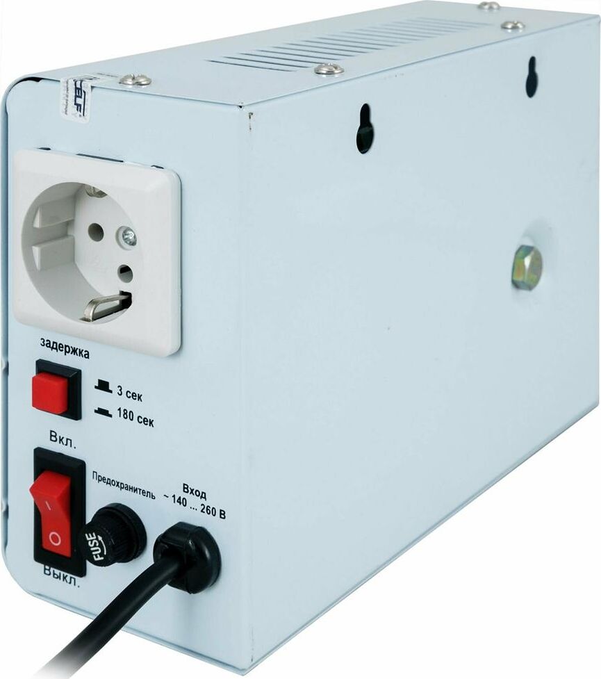 Тип стабилизации: Релейный. Мощность: 500 ВА. Диапазон стабилизации: 140-260 В. Рабочий диапазон: 130-275 В. Точность стабилизации: ±8%. Количество реле: 4. Частота: 50 Гц. Материал корпуса: металл. Кнопка выбора задержки выходного напряжения: есть (3 или 180 с). Габаритные размеры: 220х150х75 мм. Вес: 2,3 кг.