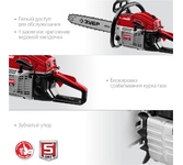 Тип двигателя бензиновый 2-тактный. Мощность 3.5 л. с.. Класс пилы бытовая. Количество звеньев 72 шт. Объем масляного бака 260 мл. Объем топливного бака 550 мл. Уровень шума 114 дБ. Объем двигателя 52. Длина шины 450 мм. Шаг цепи 0.325 дюйма. Толщина ведущего звена цепи 1.5 мм. Число оборотов холостого хода 3000 об/мин.