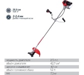 Объём двигателя 42.7 куб.см. Мощность двигателя 2.5 л.с. Диаметр ножа 25.5 см. Диаметр лески 2.0-2.4 мм. Ширина захвата 42 см. Жесткий вал. Тип рукоятки U. Объем топливного бака 1.2 л. Вес 7.3 кг.