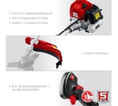 Габариты, см: 103x29x31 Мощность, л.с.: 3.3 Плечевой ремень: есть Приводной вал: жесткий Тип двигателя: бензиновый Тип ручки: u-образная (велосипедная) Частота вращения шпинделя, об/мин: 9000 Ширина скашивания для ножа, мм: 255 Мощность, кВт: 2.5 Режущий элемент: леска/диск Вес, кг: 7.3 Объем двигателя, см3: 52 Емкость бака, л: 1.2 Толщина лески, мм: 2 Ширина скашивания для лески, мм: 470 КОМПЛЕКТАЦИЯ: Коса бензиновая - 1 шт. Велосипедная рукоятка - 1 шт. Кожух защитный - 1 шт. Нож - 1 шт. Катушка с леской - 1 шт. Ключ (свечной, гаечный, имбусовый) - 3 шт. Фиксатор вала - 1 шт. Плечевой ремень - 1 шт. Емкость для смешивания - 1 шт. Руководство по эксплуатации - 1 экз.