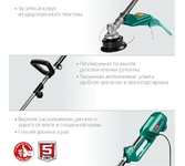 Ширина скашивания травы, мм 300 Ширина скашивания леской, мм 300 Ширина скашивания ножом, мм нет Диаметр режущей лески, мм 1,6 Рекомендуемая площадь обработки, м? 300 Тип рукоятки D-образная Тип штанги регулируемая по высоте Регулировка высоты ручки есть Приводной вал без приводного вала Форма штанги прямая Режущий элемент леска Тип ремня нет Расположение двигателя нижнее Частота вращения, об/мин 7000 Тип двигателя коллекторный Напряжение аккумулятора, В 40 Емкость аккумулятора, А*ч 2 Тип аккумулятора Li-ion Время работы на одном заряде до 30 минут Время зарядки аккумулятора до 2 часов Аккумулятор и ЗУ в комплекте один АКБ и ЗУ Уровень шума при работе, дБ 96