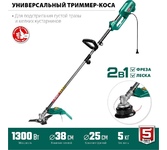 Тип двигателя: электрический. Расположение двигателя: верхнее. Форма штанги: прямая. Мощность двигателя (Вт): 1300. Тип электропитания: от электросети. Режущий элемент: леска и нож. Диаметр круга стрижки: 25.5. Диаметр используемой лески: 2. Размер используемого ножа: 230. Тип крепления триммера: плечевой ремень. Длина сетевого кабеля: 0.3. Вес товара: 4.37. Комплект поставки: Защитный щиток; пластиковый ключ; шпулька (катушка) с леской; трехлопастной нож; рукоятка дополнительная; накидной ключ; шестигранный ключ - 2 шт.; гайка - 2 шт.; пружинная шайба «гровер» - 2 шт.; винт - 2 шт.; наплечный ремень (одинарный).. Особенности: 2 оснастки: леска и нож; Сбалансированная конструкция; Питание от бытовой сети - отсутствие токсичных выхлопов, низкий уровень шума; Защита двигателя от перегрева; Защита от случайного включения.. Мощность двигателя (л.с.): 1.77. Обороты двигателя: 6000. Материал ножа: металл. Тип косильной катушки: полуавтоматическая. Форма рукоятки: P-образная. Тип штанги: разборная штанга. Посадочный